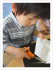 | 製作 折り紙、ハサミ、のりづけ、色ぬりを楽しく行います。 今日はお月様の丸をハサミで切ってみます。 作品の完成と「できました!」の報告は”自信”がつく大きなポイントです。 |